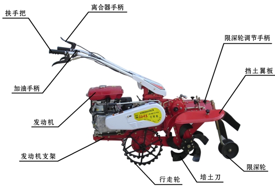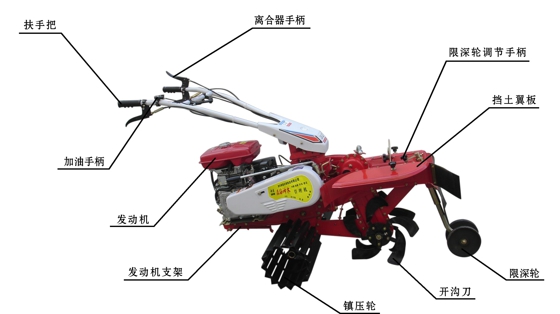 该机设计合理,结构紧凑,配有转向离合器,扶手把高度4档调整,左右360度任意旋转,操作舒适方便,作业部件插销连接,换装方便快捷。主要用于大姜、大葱、土豆等经济作物种植开沟、培土和温室大棚种植瓜果、蔬菜等作物旋耕、开沟等。